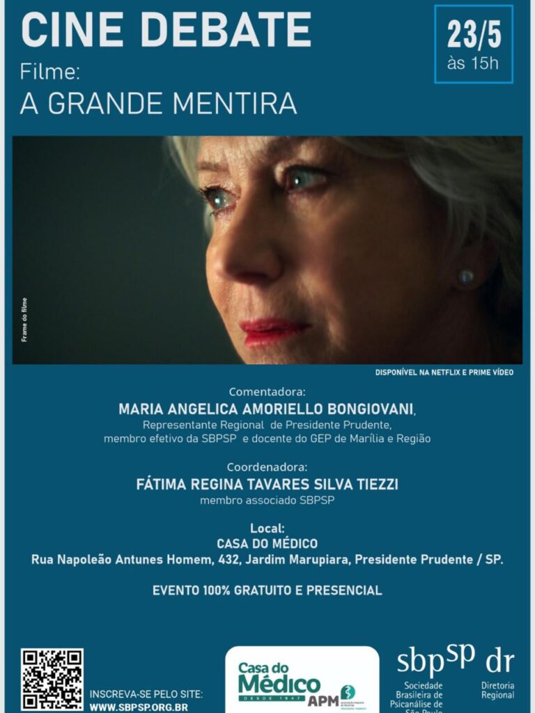 Após a exibição, o debate será conduzido por Maria Angélica Amoriello Bongiovani, Representante Regional de Presidente Prudente, membro efetivo da SBPSP e docente do GEP de Marília e Região, trazendo uma abordagem qualificada e sensível sobre o conteúdo apresentado. A coordenação do evento ficará a cargo de Fátima Regina Tavares Silva Tiezzi, membro associado da SBPSP.